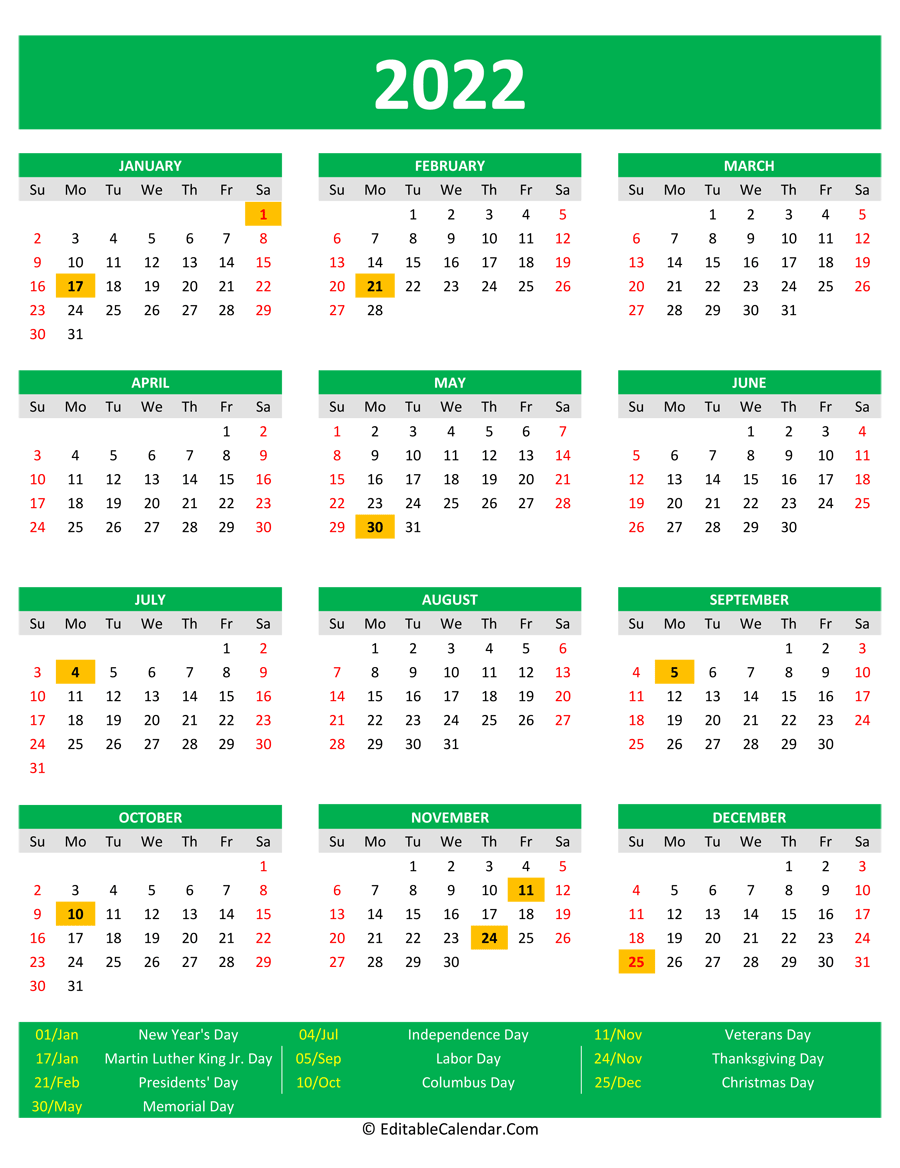 You are downloading 2022 Printable Calendar Holidays Portrait in word and pdf format. With word calendar (.docx format), it can be edit color, font size or add your notes before print.