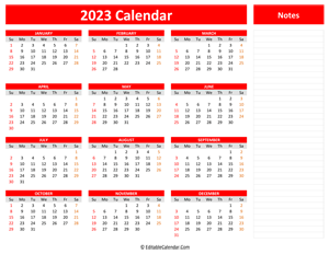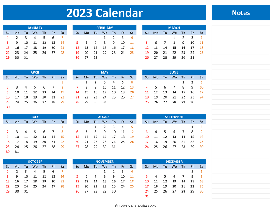 You are downloading 2023 Yearly Calendar Notes in word and pdf format. With word calendar (.docx format), it can be edit color, font size or add your notes before print.