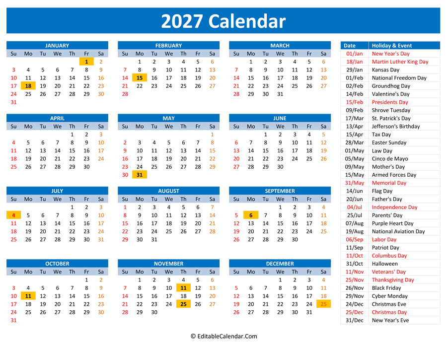 You are downloading 2027 Printable Calendar Holidays in word and pdf format. With word calendar (.docx format), it can be edit color, font size or add your notes before print.