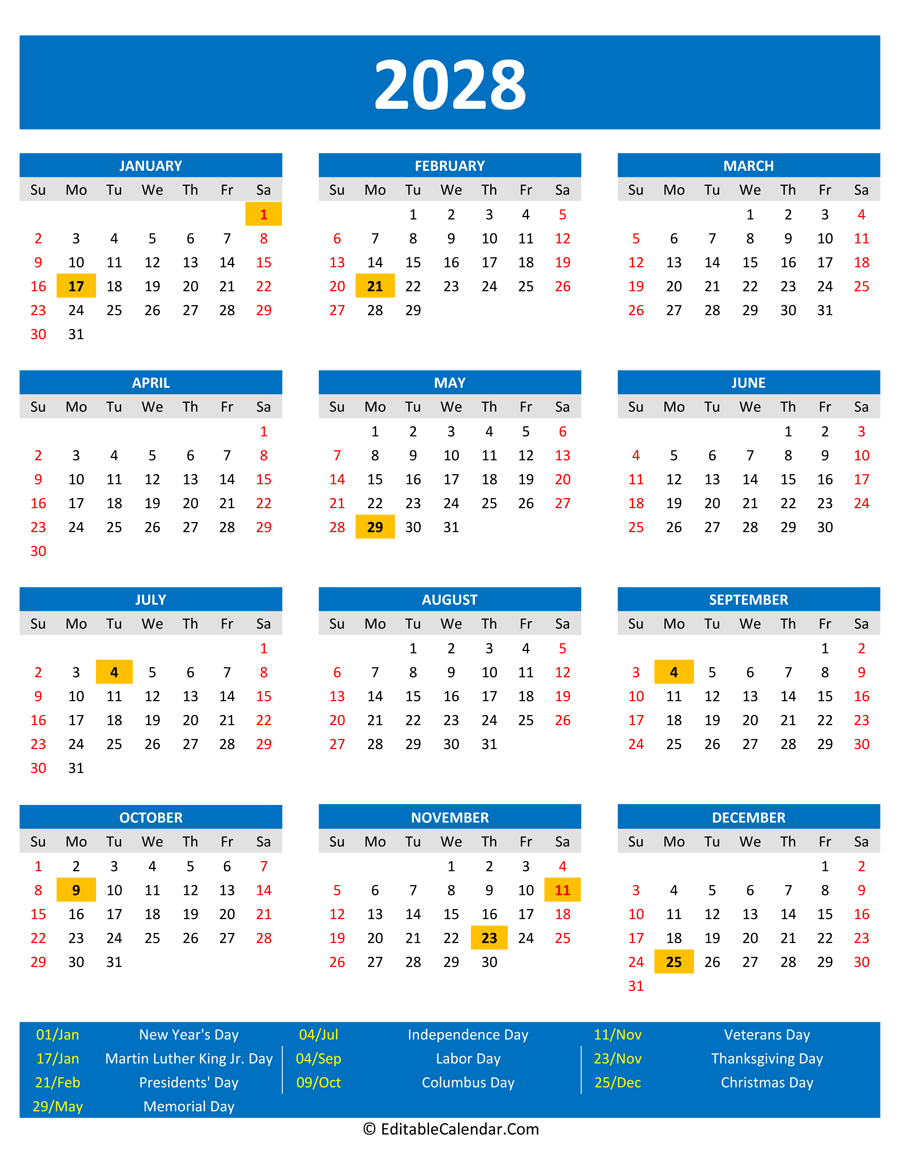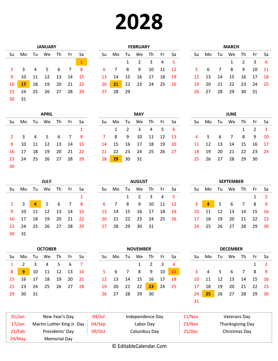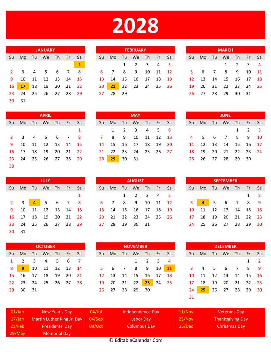 You are downloading 2028 Printable Calendar Holidays Portrait in word and pdf format. With word calendar (.docx format), it can be edit color, font size or add your notes before print.