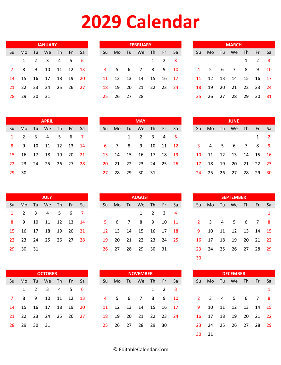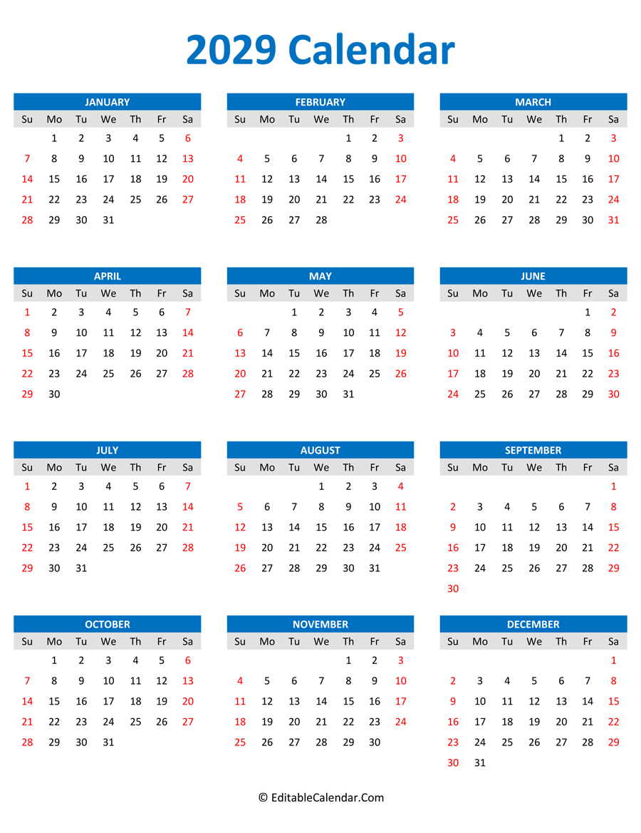 You are downloading 2029 Calendar Portrait in word and pdf format. With word calendar (.docx format), it can be edit color, font size or add your notes before print.