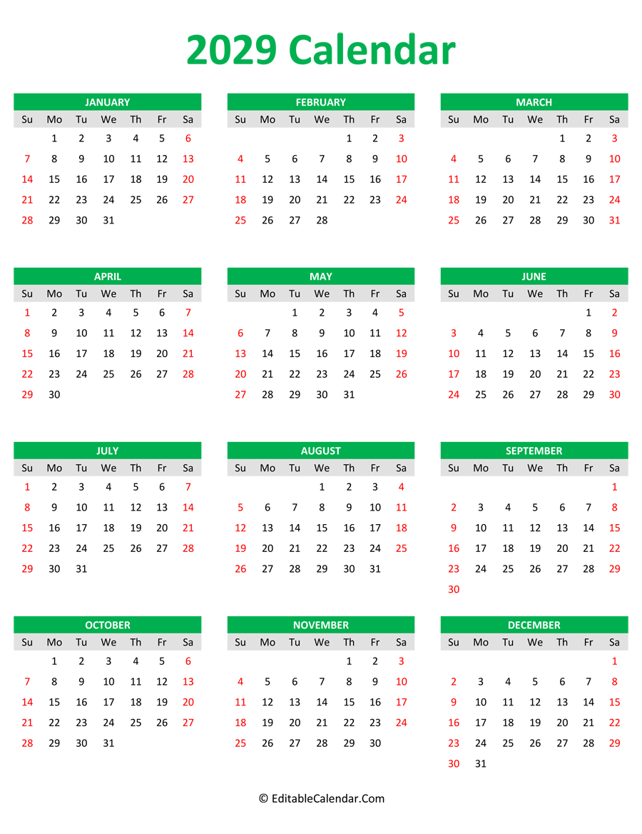 Download other printable calendar 2029 in green, red and blue layout.