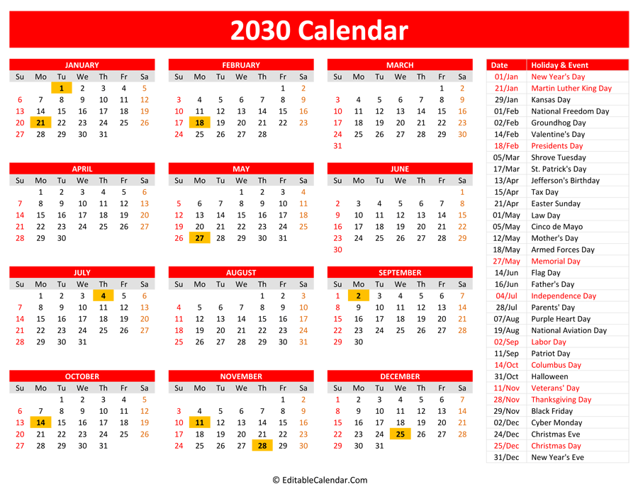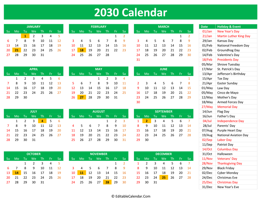 You are downloading 2030 Printable Calendar Holidays in word and pdf format. With word calendar (.docx format), it can be edit color, font size or add your notes before print.