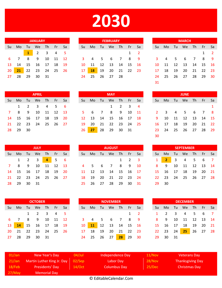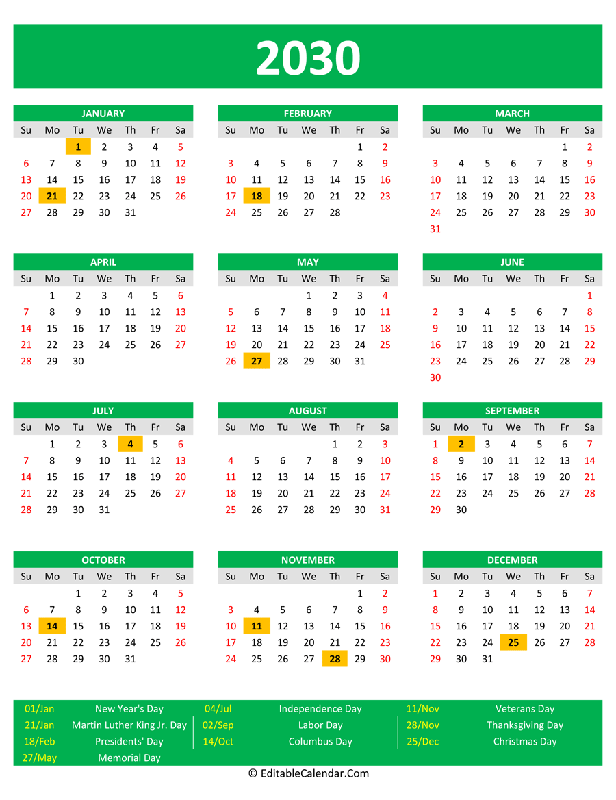You are downloading 2030 Printable Calendar Holidays Portrait in word and pdf format. With word calendar (.docx format), it can be edit color, font size or add your notes before print.