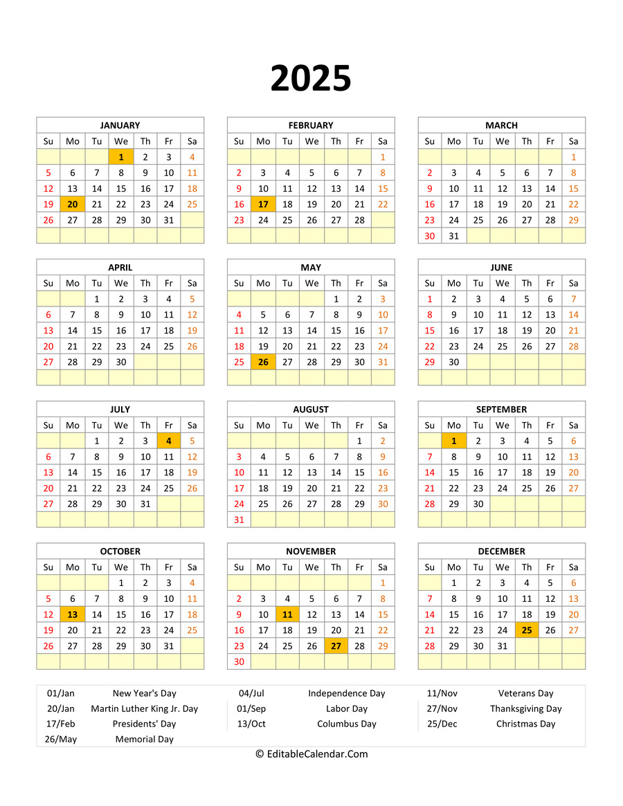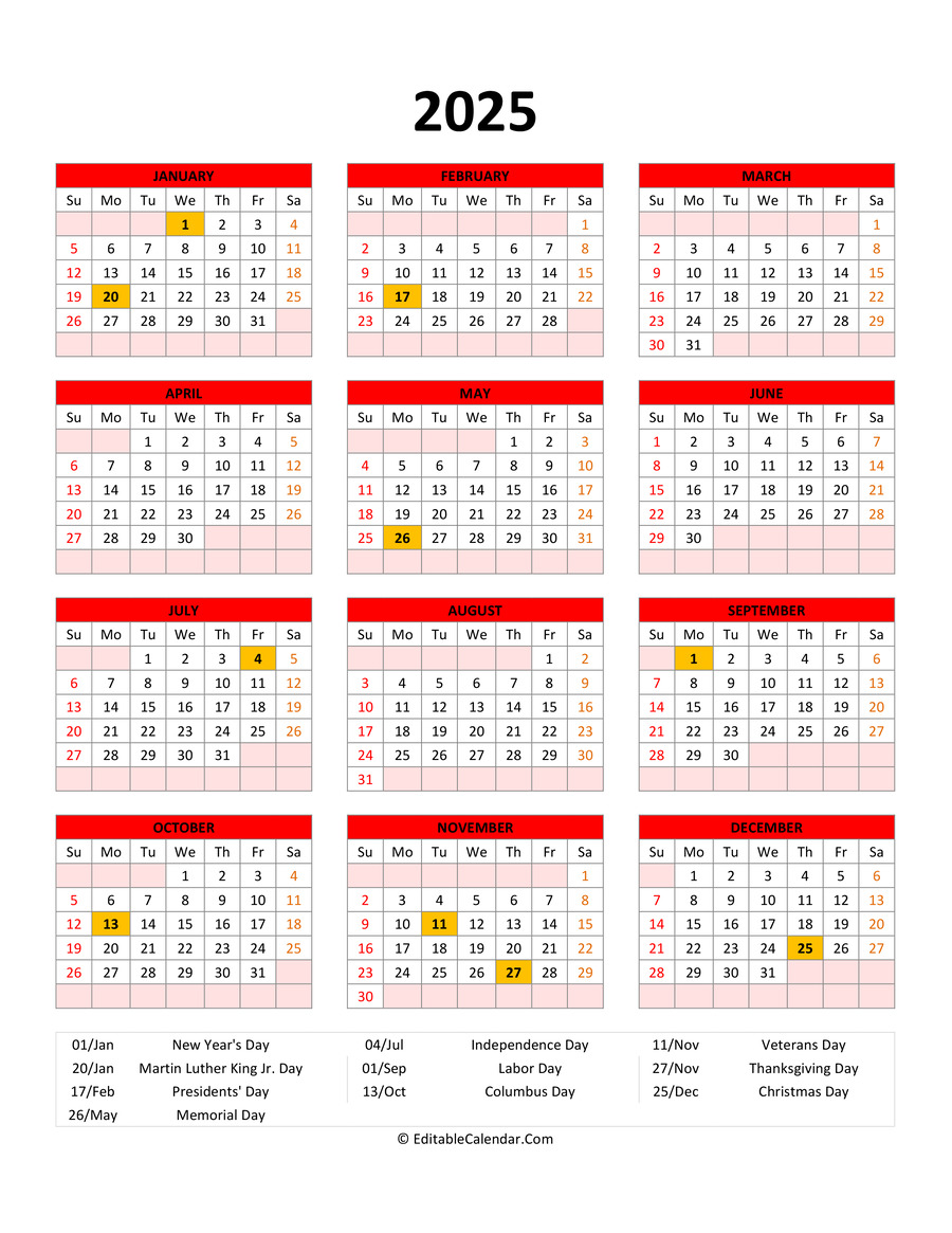 You are downloading Editable 2025 Calendar With Holidays in word and pdf format. With word calendar (.docx format), it can be edit color, font size or add your notes before print.