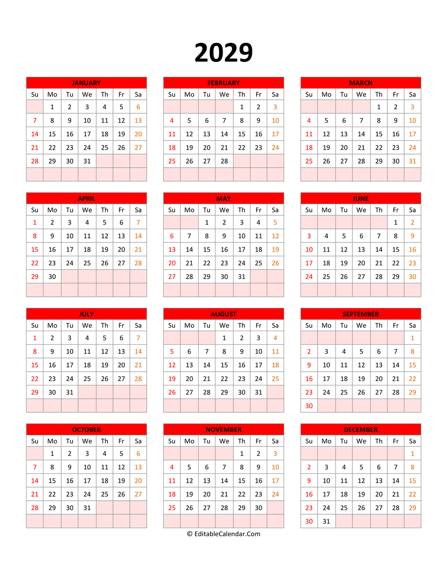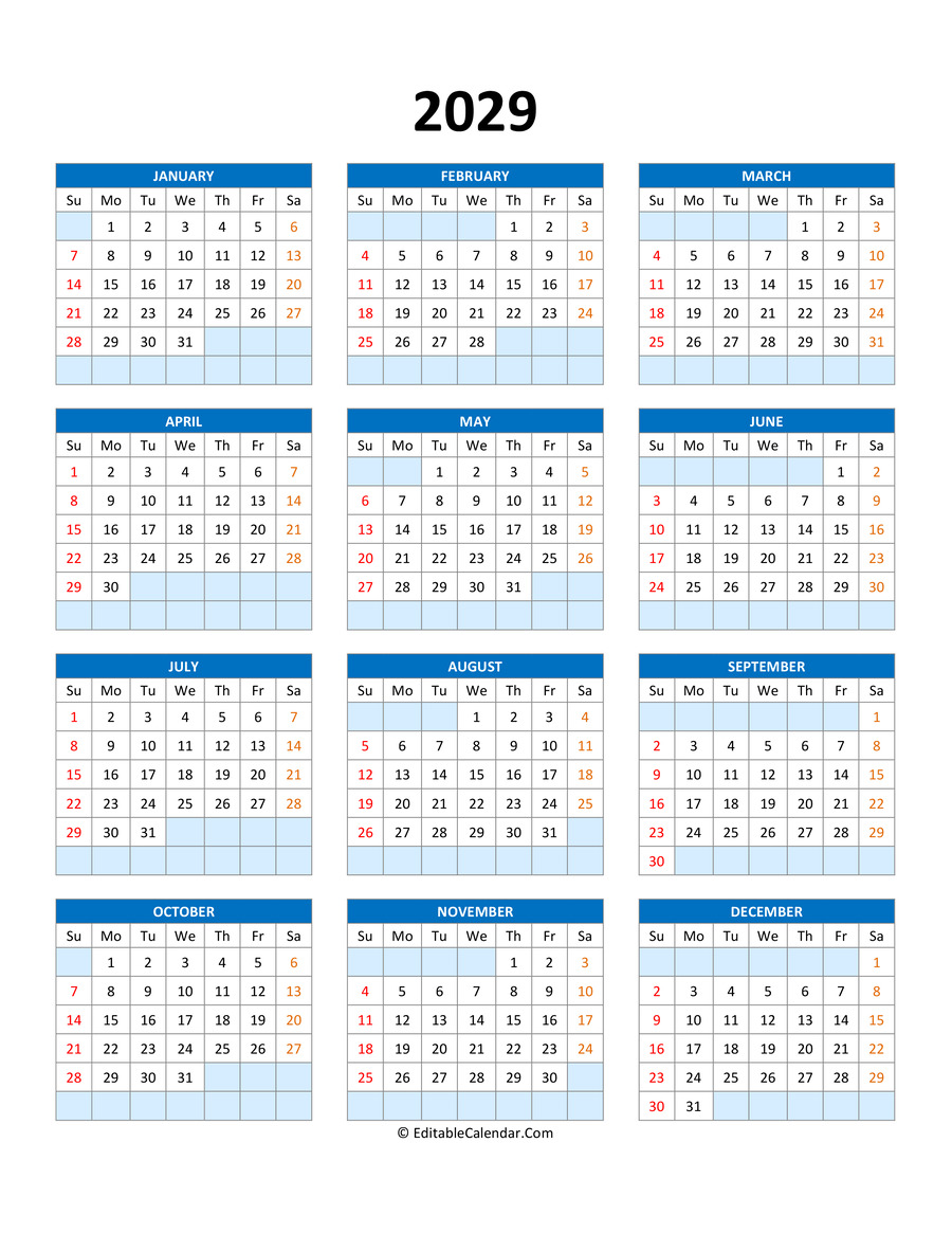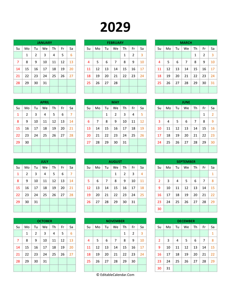 You are downloading Editable Calendar Template 2029 in word and pdf format. With word calendar (.docx format), it can be edit color, font size or add your notes before print.