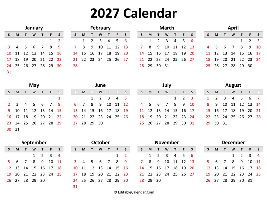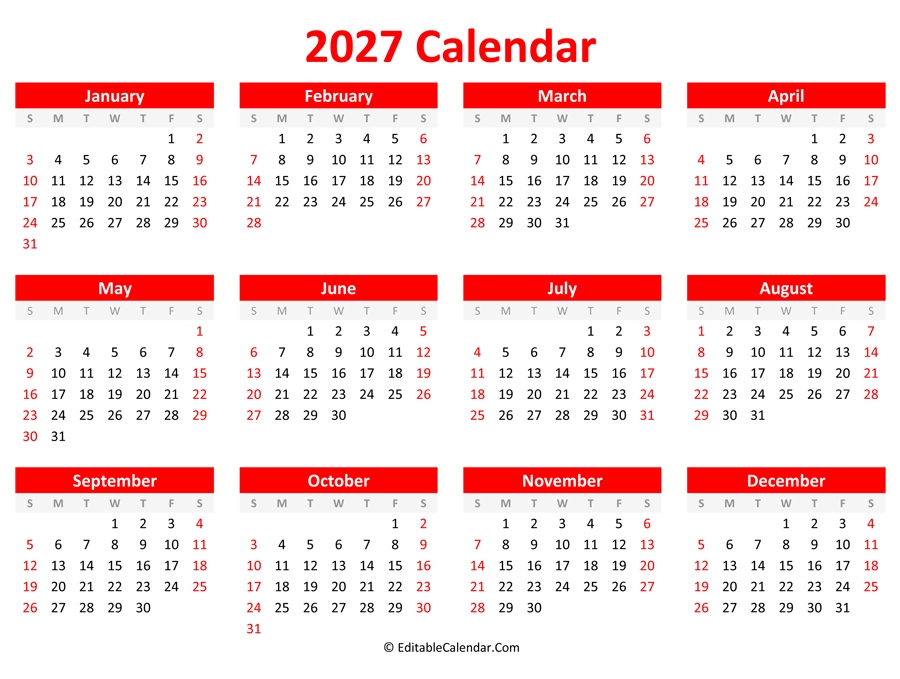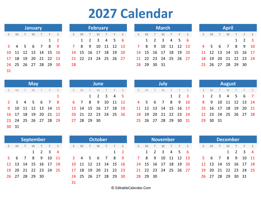 You are downloading Printable 2027 Calendar Landscape in word and pdf format. With word calendar (.docx format), it can be edit color, font size or add your notes before print.