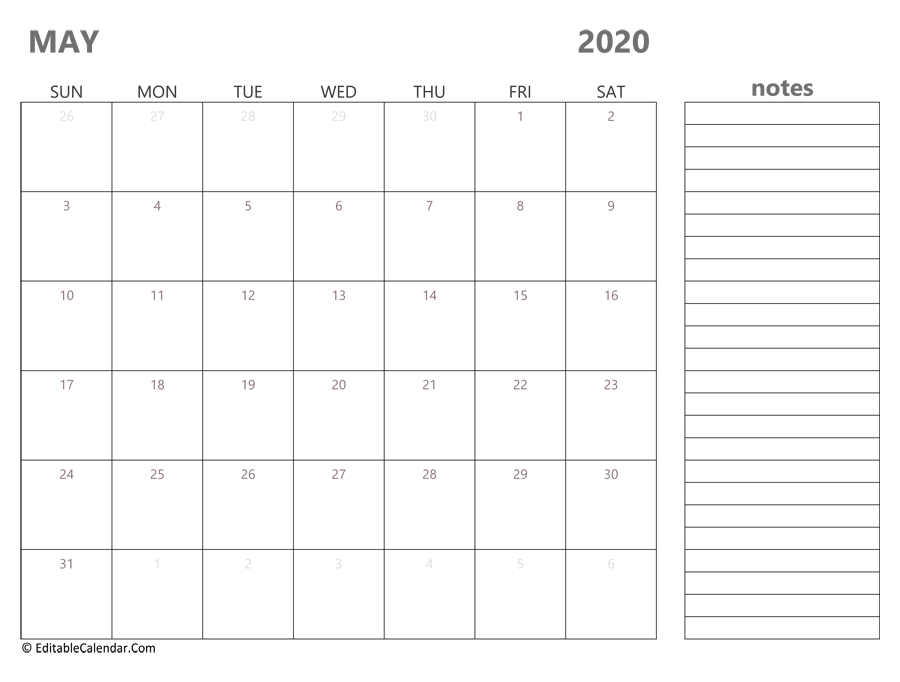 May 2020 Printable Calendar with Holidays is the first calendar we want to share to you. The calendar come with small space for notes at the bottom. It also include special holidays and observances for May.