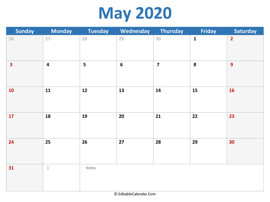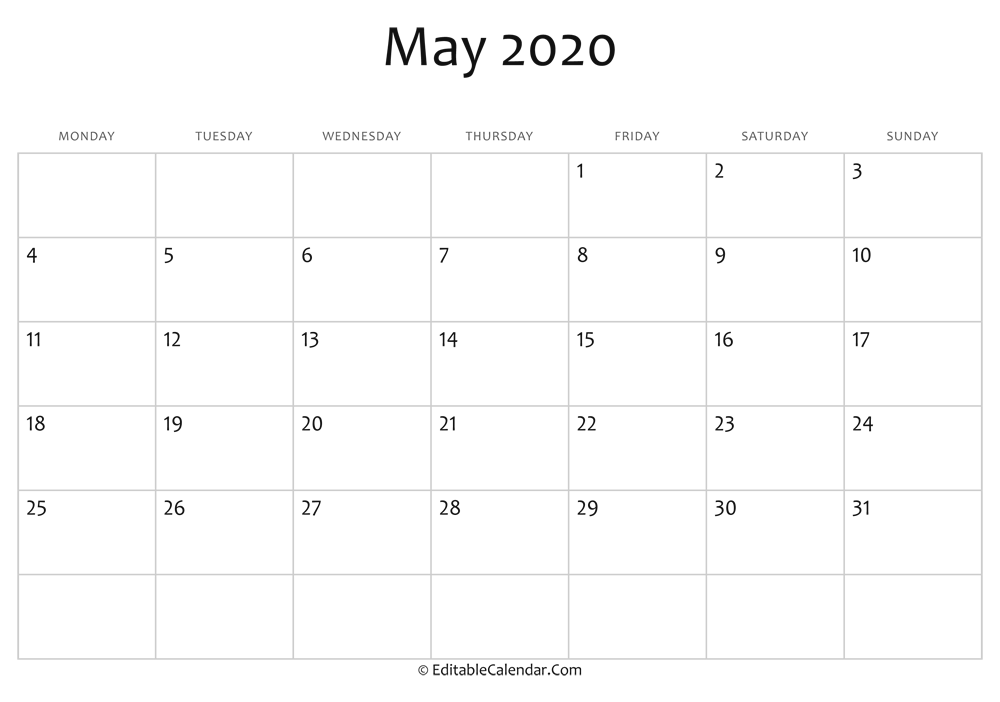At EditableCalendar.Com you can download and print for free but dont forget to share this calendar to your friends via facebook, twitter, pinterest. Copy and paste this code to your website, blog if you want to share this May 2020 Printable Calendar.