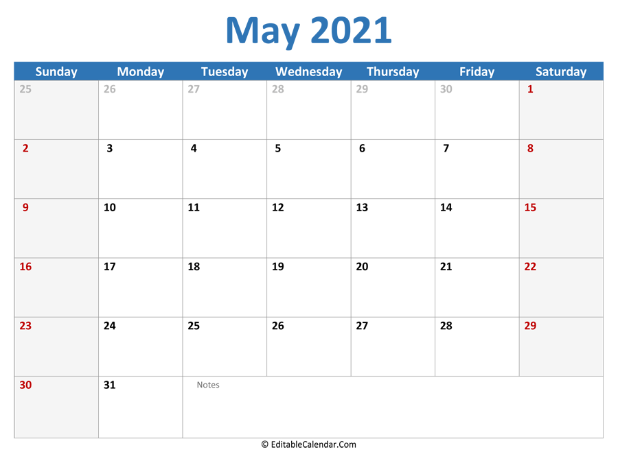 May 2021 Printable Calendar with Holidays is the first calendar we want to share to you. The calendar come with small space for notes at the bottom. It also include special holidays and observances for May.