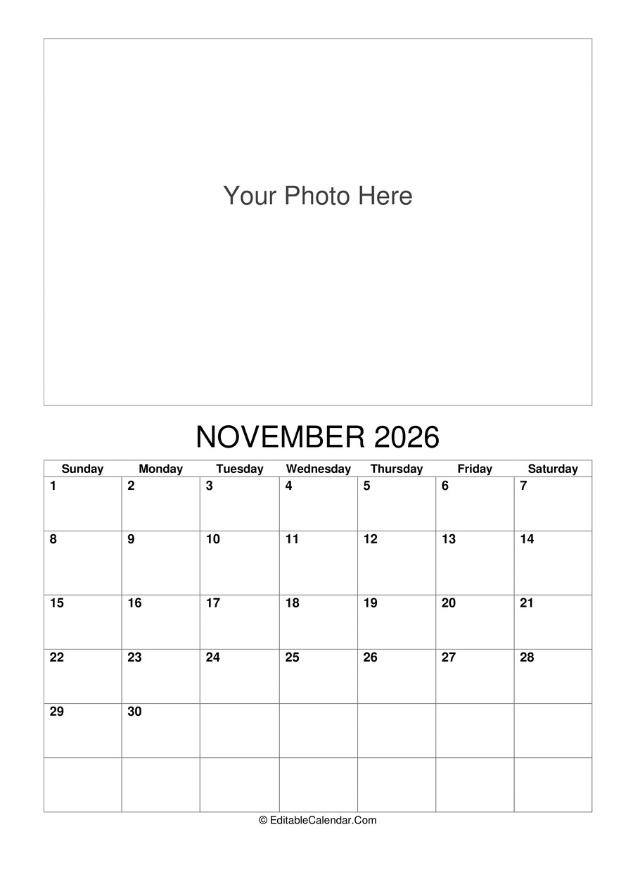 At EditableCalendar.Com you can download and print for free but dont forget to share this calendar to your friends via facebook, twitter, pinterest. Copy and paste this code to your website, blog if you want to share this November 2026 Calendar Templates in Word, PDF, Excel.