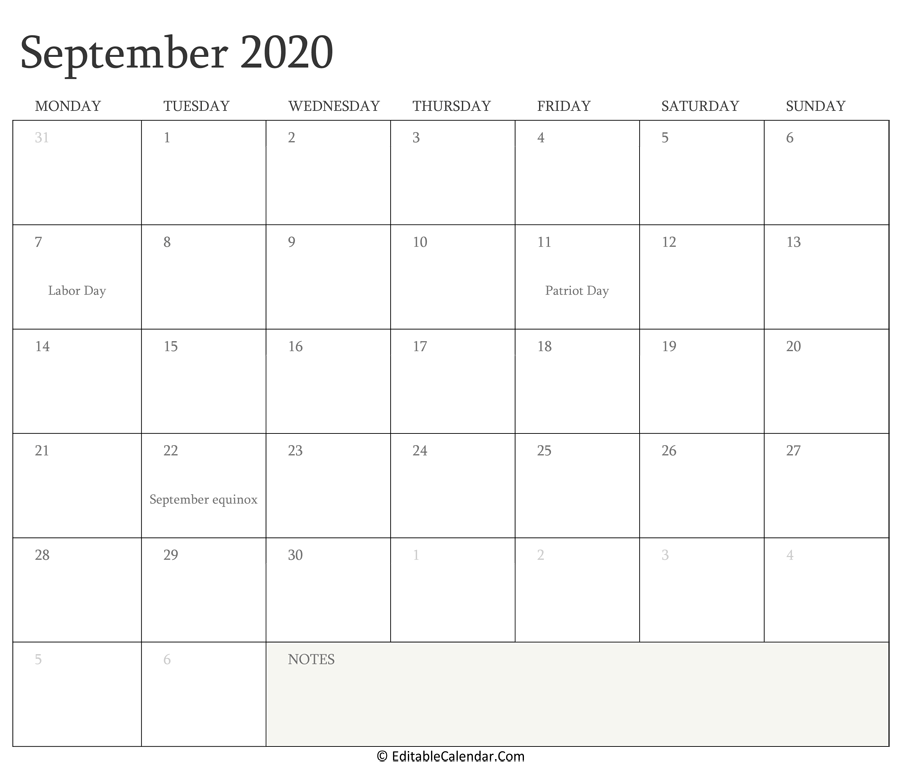 September 2020 Editable Calendar with Holidays
